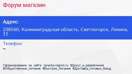 Форум, магазин по адресу 238560, Калининградская область, Светлогорск, Ленина, 15 в дальнейшем Организация, размещена в следующих категориях: