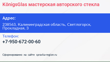 KönigsGlas, мастерская авторского стекла по адресу 238563, Калининградская область, Светлогорск, Прохладная, 3 в дальнейшем Организация, размещена в следующих категориях:
