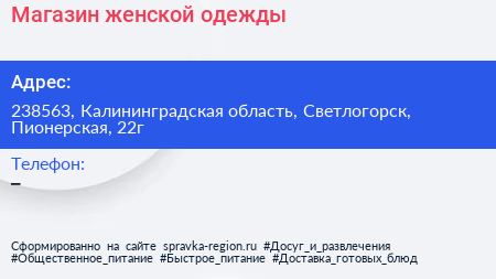 Магазин женской одежды по адресу 238563, Калининградская область, Светлогорск, Пионерская, 22г в дальнейшем Организация, размещена в следующих категориях: