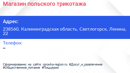 Магазин польского трикотажа по адресу 238560, Калининградская область, Светлогорск, Ленина, 22 в дальнейшем Организация, размещена в следующих категориях: