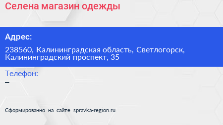 Селена, магазин одежды по адресу 238560, Калининградская область, Светлогорск, Калининградский проспект, 35 в дальнейшем Организация, размещена в следующих категориях: