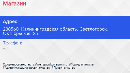 Магазин по адресу 238560, Калининградская область, Светлогорск, Октябрьская, 2а в дальнейшем Организация, размещена в следующих категориях: