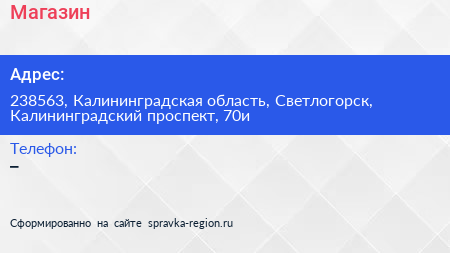 Магазин по адресу 238563, Калининградская область, Светлогорск, Калининградский проспект, 70и в дальнейшем Организация, размещена в следующих категориях: