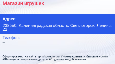 Магазин игрушек по адресу 238560, Калининградская область, Светлогорск, Ленина, 22 в дальнейшем Организация, размещена в следующих категориях:
