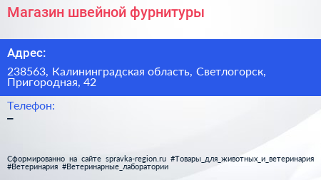 Магазин швейной фурнитуры по адресу 238563, Калининградская область, Светлогорск, Пригородная, 42 в дальнейшем Организация, размещена в следующих категориях: