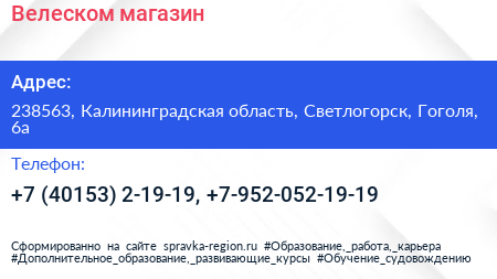 Велеском, магазин по адресу 238563, Калининградская область, Светлогорск, Гоголя, 6а в дальнейшем Организация, размещена в следующих категориях: