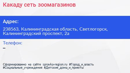 Какаду, сеть зоомагазинов по адресу 238563, Калининградская область, Светлогорск, Калининградский проспект, 2а в дальнейшем Организация, размещена в следующих категориях: