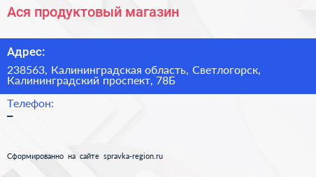 Ася, продуктовый магазин по адресу 238563, Калининградская область, Светлогорск, Калининградский проспект, 78Б в дальнейшем Организация, размещена в следующих категориях: