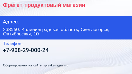 Фрегат, продуктовый магазин по адресу 238560, Калининградская область, Светлогорск, Октябрьская, 10 в дальнейшем Организация, размещена в следующих категориях: