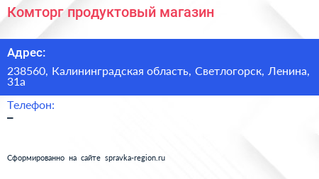 Комторг, продуктовый магазин по адресу 238560, Калининградская область, Светлогорск, Ленина, 31а в дальнейшем Организация, размещена в следующих категориях: