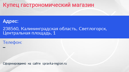 Купец, гастрономический магазин по адресу 238560, Калининградская область, Светлогорск, Центральная площадь, 1 в дальнейшем Организация, размещена в следующих категориях: