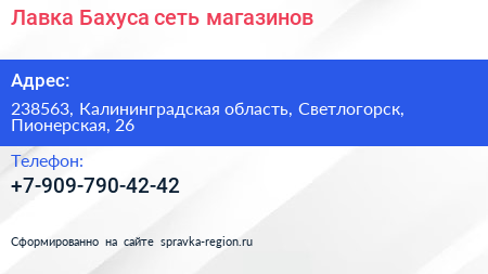 Лавка Бахуса, сеть магазинов по адресу 238563, Калининградская область, Светлогорск, Пионерская, 26 в дальнейшем Организация, размещена в следующих категориях: