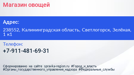 Магазин овощей по адресу 238552, Калининградская область, Светлогорск, Зелёная, 1 к1 в дальнейшем Организация, размещена в следующих категориях: