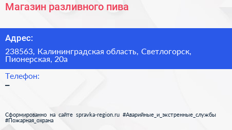 Магазин разливного пива по адресу 238563, Калининградская область, Светлогорск, Пионерская, 20а в дальнейшем Организация, размещена в следующих категориях: