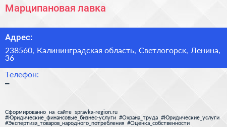 Марципановая лавка по адресу 238560, Калининградская область, Светлогорск, Ленина, 36 в дальнейшем Организация, размещена в следующих категориях: