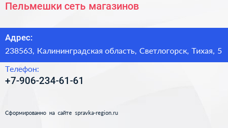 Пельмешки, сеть магазинов по адресу 238563, Калининградская область, Светлогорск, Тихая, 5 в дальнейшем Организация, размещена в следующих категориях: