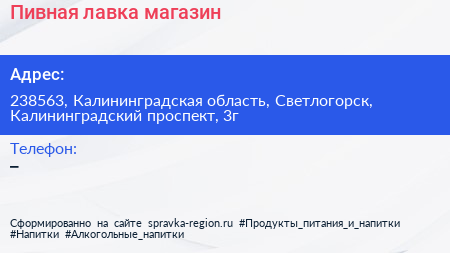 Пивная лавка, магазин по адресу 238563, Калининградская область, Светлогорск, Калининградский проспект, 3г в дальнейшем Организация, размещена в следующих категориях: