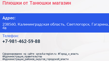 Плюшки от Танюшки, магазин по адресу 238560, Калининградская область, Светлогорск, Гагарина, 4в в дальнейшем Организация, размещена в следующих категориях:
