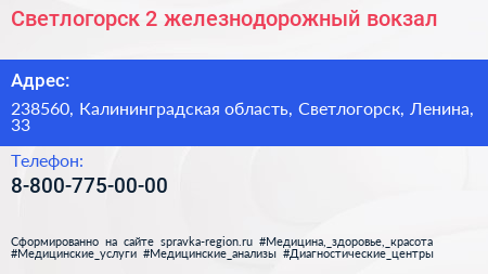 Светлогорск-2, железнодорожный вокзал по адресу 238560, Калининградская область, Светлогорск, Ленина, 33 в дальнейшем Организация, размещена в следующих категориях: