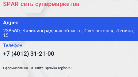 SPAR, сеть супермаркетов по адресу 238560, Калининградская область, Светлогорск, Ленина, 15 в дальнейшем Организация, размещена в следующих категориях: