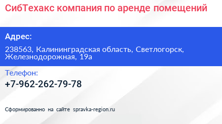 СибТехакс, компания по аренде помещений по адресу 238563, Калининградская область, Светлогорск, Железнодорожная, 19а в дальнейшем Организация, размещена в следующих категориях: