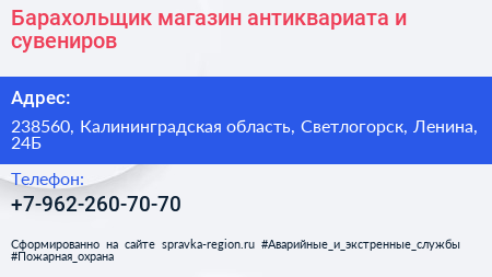 Барахольщик, магазин антиквариата и сувениров по адресу 238560, Калининградская область, Светлогорск, Ленина, 24Б в дальнейшем Организация, размещена в следующих категориях:
