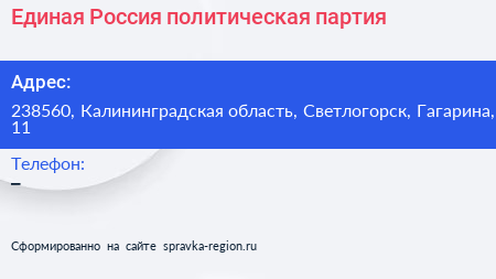 Единая Россия, политическая партия по адресу 238560, Калининградская область, Светлогорск, Гагарина, 11 в дальнейшем Организация, размещена в следующих категориях:
