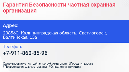 Гарантия Безопасности, частная охранная организация по адресу 238560, Калининградская область, Светлогорск, Балтийская, 15а в дальнейшем Организация, размещена в следующих категориях: