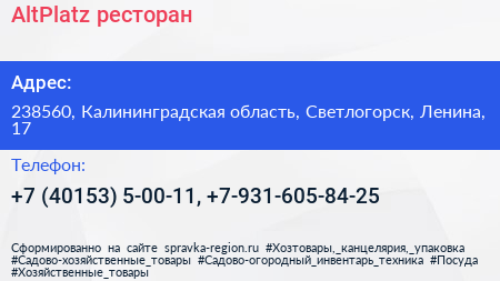AltPlatz, ресторан по адресу 238560, Калининградская область, Светлогорск, Ленина, 17 в дальнейшем Организация, размещена в следующих категориях: