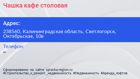 Чашка, кафе-столовая по адресу 238560, Калининградская область, Светлогорск, Октябрьская, 10в в дальнейшем Организация, размещена в следующих категориях: