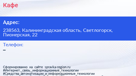Кафе по адресу 238563, Калининградская область, Светлогорск, Пионерская, 22 в дальнейшем Организация, размещена в следующих категориях: