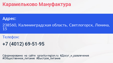 Карамельково Мануфактура по адресу 238560, Калининградская область, Светлогорск, Ленина, 15 в дальнейшем Организация, размещена в следующих категориях: