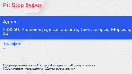 Pit Stop, буфет по адресу 238560, Калининградская область, Светлогорск, Морская, 4а в дальнейшем Организация, размещена в следующих категориях: