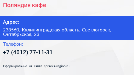 Поляндия, кафе по адресу 238560, Калининградская область, Светлогорск, Октябрьская, 23 в дальнейшем Организация, размещена в следующих категориях: