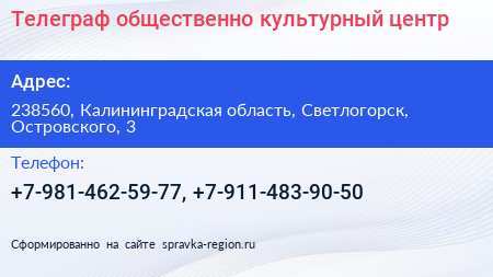 Телеграф, общественно-культурный центр по адресу 238560, Калининградская область, Светлогорск, Островского, 3 в дальнейшем Организация, размещена в следующих категориях: