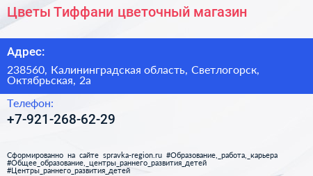 Цветы Тиффани, цветочный магазин по адресу 238560, Калининградская область, Светлогорск, Октябрьская, 2а в дальнейшем Организация, размещена в следующих категориях: