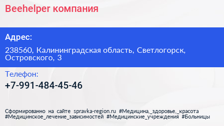 Beehelper, компания по адресу 238560, Калининградская область, Светлогорск, Островского, 3 в дальнейшем Организация, размещена в следующих категориях: