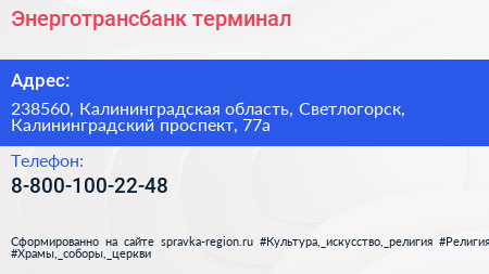 Энерготрансбанк, терминал по адресу 238560, Калининградская область, Светлогорск, Калининградский проспект, 77а в дальнейшем Организация, размещена в следующих категориях: