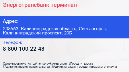 Энерготрансбанк, терминал по адресу 238563, Калининградская область, Светлогорск, Калининградский проспект, 20Б в дальнейшем Организация, размещена в следующих категориях:
