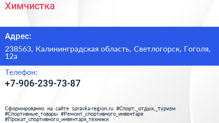 Химчистка по адресу 238563, Калининградская область, Светлогорск, Гоголя, 12а в дальнейшем Организация, размещена в следующих категориях:
