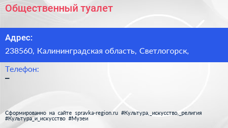 Общественный туалет по адресу 238560, Калининградская область, Светлогорск, в дальнейшем Организация, размещена в следующих категориях: