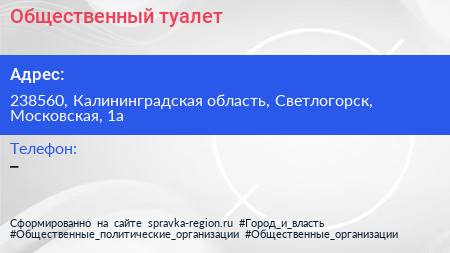 Общественный туалет по адресу 238560, Калининградская область, Светлогорск, Московская, 1а в дальнейшем Организация, размещена в следующих категориях: