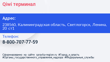Qiwi, терминал по адресу 238560, Калининградская область, Светлогорск, Ленина, 20 ст1 в дальнейшем Организация, размещена в следующих категориях: