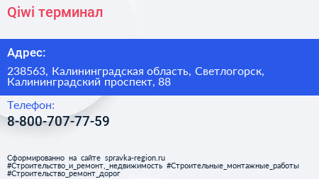 Qiwi, терминал по адресу 238563, Калининградская область, Светлогорск, Калининградский проспект, 88 в дальнейшем Организация, размещена в следующих категориях: