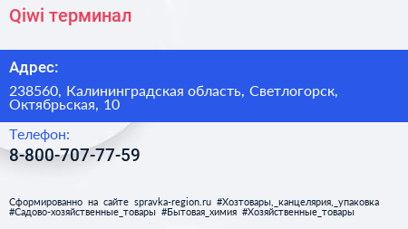 Qiwi, терминал по адресу 238560, Калининградская область, Светлогорск, Октябрьская, 10 в дальнейшем Организация, размещена в следующих категориях: