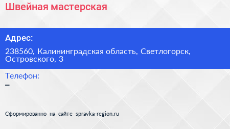 Швейная мастерская по адресу 238560, Калининградская область, Светлогорск, Островского, 3 в дальнейшем Организация, размещена в следующих категориях: