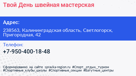 Твой День, швейная мастерская по адресу 238563, Калининградская область, Светлогорск, Пригородная, 42 в дальнейшем Организация, размещена в следующих категориях: