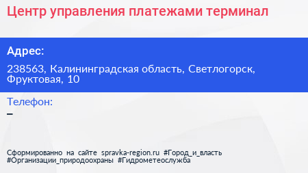 Центр управления платежами, терминал по адресу 238563, Калининградская область, Светлогорск, Фруктовая, 10 в дальнейшем Организация, размещена в следующих категориях: