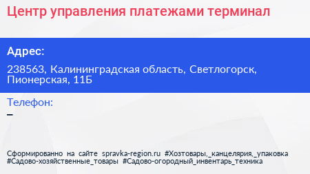 Центр управления платежами, терминал по адресу 238563, Калининградская область, Светлогорск, Пионерская, 11Б в дальнейшем Организация, размещена в следующих категориях: