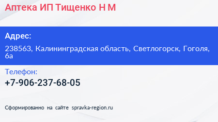Аптека, ИП Тищенко Н.М. по адресу 238563, Калининградская область, Светлогорск, Гоголя, 6а в дальнейшем Организация, размещена в следующих категориях: